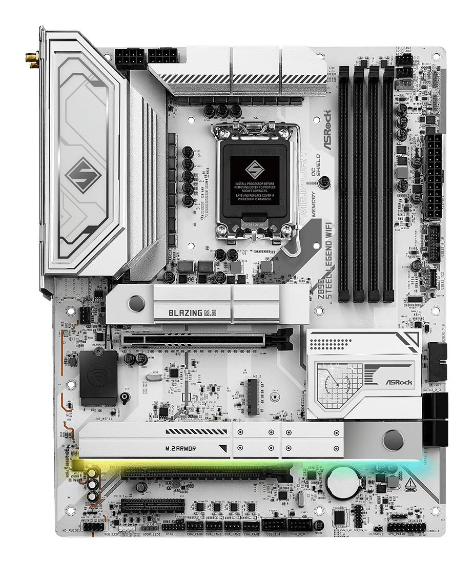 Summary Asrock Z890 Steel Legend WiFi. Processor manufacturer: Intel, Processor socket: LGA 1851 (Socket V1), Compatible processor series: Intel Core Ultra (Series 2). Supported memory types: DDR5-SDRAM, Maximum internal memory: 256 GB, Memory slots type: DIMM. Supported storage drive interfaces: M.2, SATA III, RAID levels: 0, 1, 5, 10. Ethernet interface type: 2.5 Gigabit Ethernet, LAN controller: Dragon RTL8125BG, Top Wi-Fi standard: Wi-Fi 7 (802.11be). Component for: PC, Motherboard form factor: ATX, Motherboard chipset family: Intel