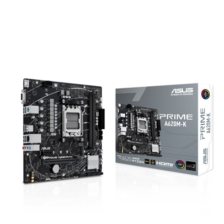 Asus PRIME A620M-K Processor family AMD, Processor socket AM5, DDR5 DIMM, Memory slots 2, Supported hard disk drive interfaces SATA, M.2, Number of SATA connectors 4, Chipset AMD A620, micro-ATX