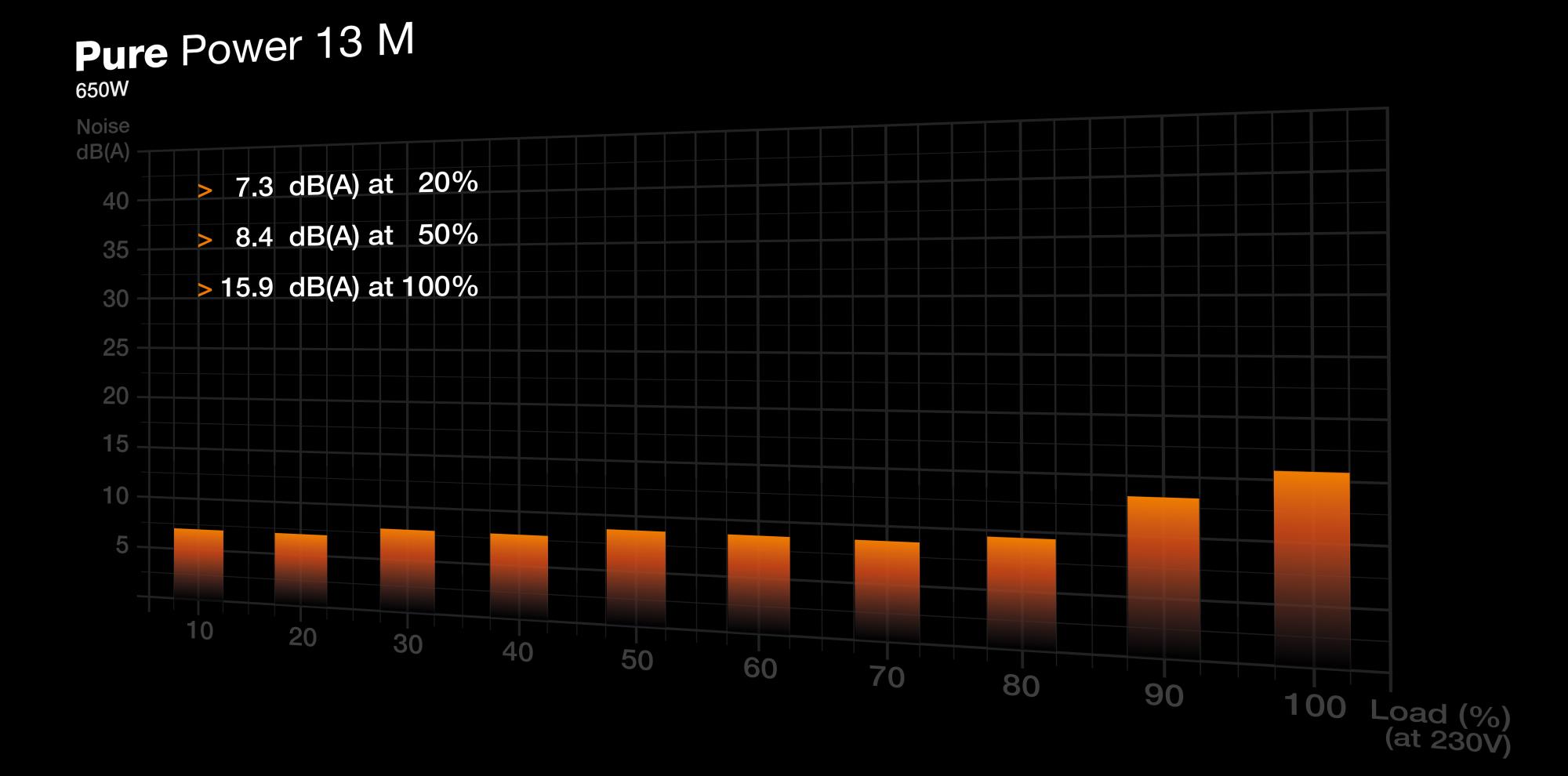 be quiet! Pure Power 13 M | 650W. Total power: 650 W, AC input voltage: 100 - 240 V, Peak power: 720 W. Motherboard power connector: 20+4 pin ATX, Motherboard power cable length: 55 cm, SATA power cable length: 500,650,800 mm. Purpose: PC, Power supply unit (PSU) form factor: ATX, 80 PLUS certification: 80 PLUS Gold. Product colour: Black, Cooling type: Active, Fan diameter: 12 cm. Cables included: AC, CPU, PCIe, Peripheral (Molex), SATA