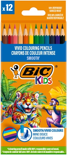 A box of 12 assorted BIC Kids colouring pencils that ensure a smooth colouring experience in vivid colours. They are made with 100% responsibly sourced wood. They are easy to sharpen for hours of colouring fun. The hexagonal barrel design ensures a firm grip and stops them rolling off the table.