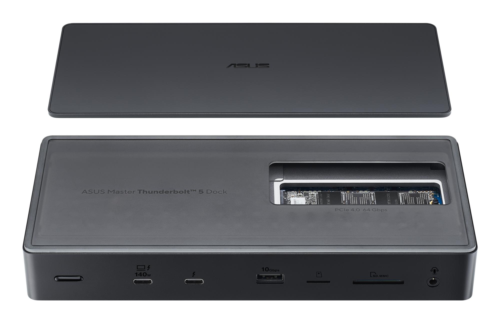 Summary ASUS Master Thunderbolt 5 Dock DC510. Connectivity technology: Wired, Host interface: Thunderbolt 5, USB Power Delivery up to: 140 W. Ethernet LAN data rates: 2500 Mbit/s. Product colour: Black, Compatible memory cards: MicroSD (TransFlash), SD, Supported storage drive types: SSD. Power source type: DC, Input current: 9 A, Power cable length: 1 m. Width: 220 mm, Depth: 96.7 mm, Height: 38.1 mm