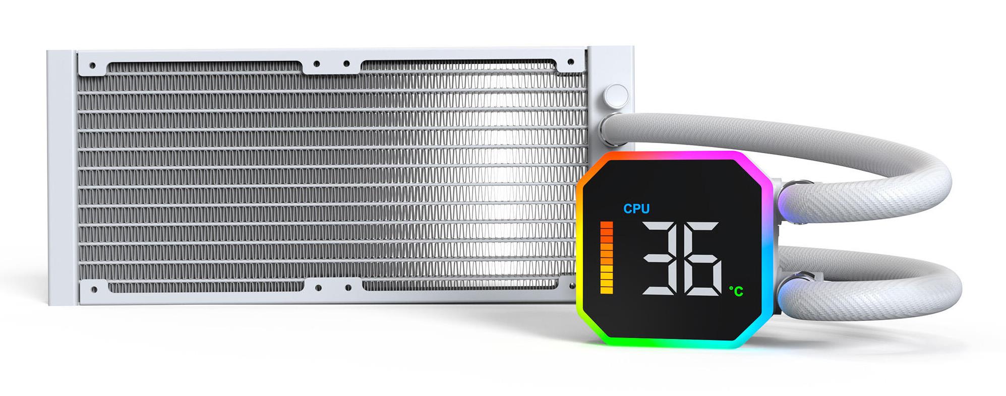 Montech HyperFlow Digital 240. Type: All-in-one liquid cooler, Fan diameter: 12 cm, Airflow: 129.5 m³/h, Maximum air pressure: 96.27 mmH2O, Bearing type: Fluid Dynamic Bearing (FDB). Product colour: White