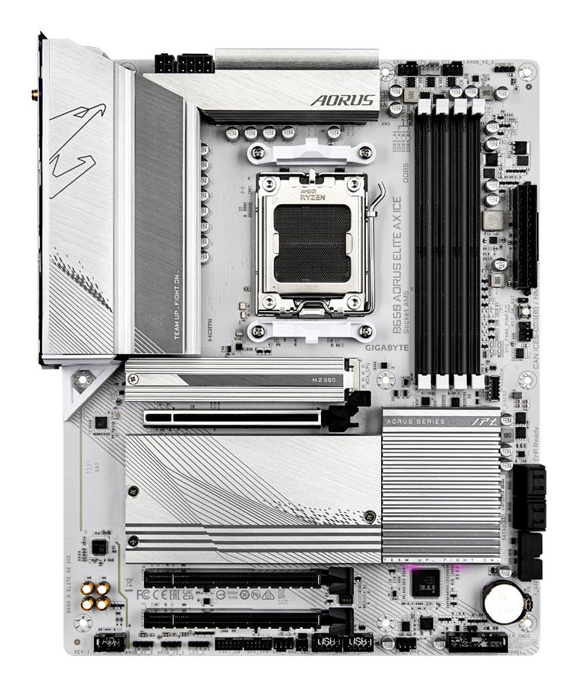 GIGABYTE B650 AORUS ELITE AX ICE Motherboard - Supports AMD Ryzen 9000 CPUs, 12+2+2 Phases Digital VRM, up to 8000MHz DDR5 (OC), 1xPCIe 5.0 + 2xPCIe 4.0 M.2, Wi-Fi 6E, 2.5GbE LAN, USB 3.2 Gen 2x2. Processor manufacturer: AMD, Processor socket: Socket AM5, Compatible processor series: AMD Ryzen 7000 Series, AMD Ryzen 8000 Series, AMD Ryzen 9000 Series. Supported memory types: DDR5-SDRAM, Maximum internal memory: 256 GB, Memory slots type: DIMM. Supported storage drive interfaces: M.2, SATA III, Supported storage drive types: HDD & SSD, RAID levels: 0, 1, 10. Maximum resolution: 4096 x 2160 pixels. Ethernet interface type: 2.5 Gigabit Ethernet, LAN controller: Realtek RTL8125, Top Wi-Fi standard: Wi-Fi 6E (802.11ax)
