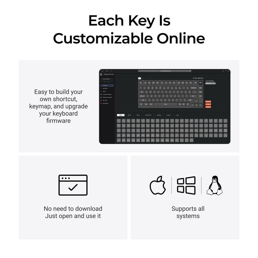 Keychron Q1 Max. Keyboard style: Straight. Connectivity technology: Wired & Wireless, Device interface: USB + RF Wireless + Bluetooth, Keyboard key switch: Mechanical, Keyboard layout: QWERTY, Keyboard number of keys: 81. Backlight type: RGB LED. Recommended usage: Gaming. Product colour: Black, Cyan, Dark Blue, White