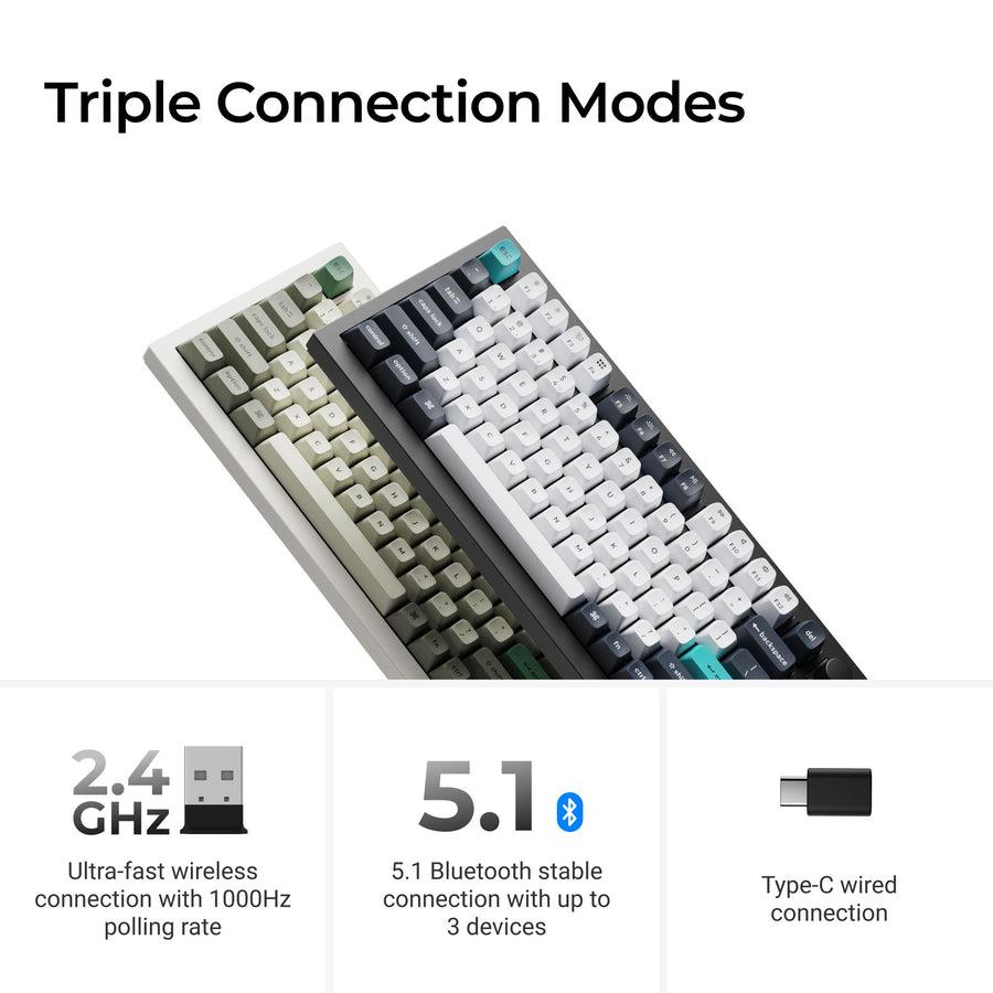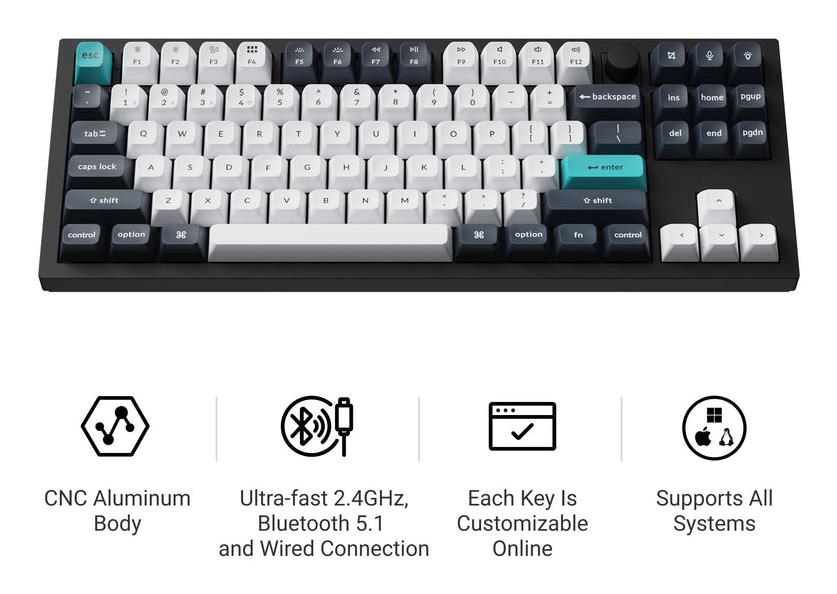 Keychron Q3 Max. Keyboard form factor: 80%. Keyboard style: Straight. Connectivity technology: Wired & Wireless, Device interface: USB + RF Wireless + Bluetooth, Keyboard key switch: Mechanical, Keyboard layout: QWERTY, Keyboard number of keys: 87. Backlight type: RGB LED. Recommended usage: Gaming. Product colour: Black, Cyan, Dark Blue, White