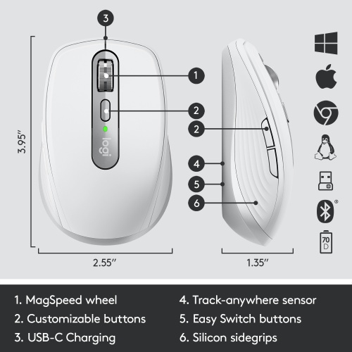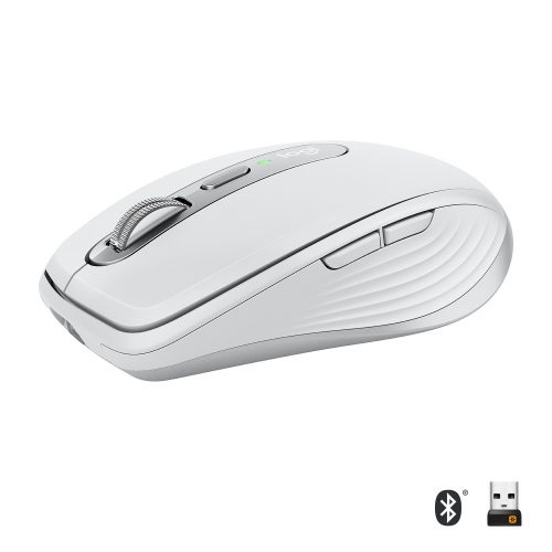 Logitech MX Anywhere 3 Compact Performance. Form factor: Right-hand. Device interface: RF Wireless+Bluetooth, Movement resolution: 4000 DPI, Buttons type: Pressed buttons, Buttons quantity: 6, Scroll type: Wheel. Power source: Batteries. Works on any surface. Product colour: Grey, White