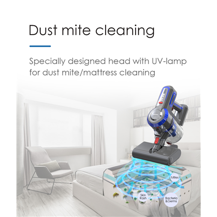 Specially designed head with UV-lamp for dust mite/mattress cleaning.