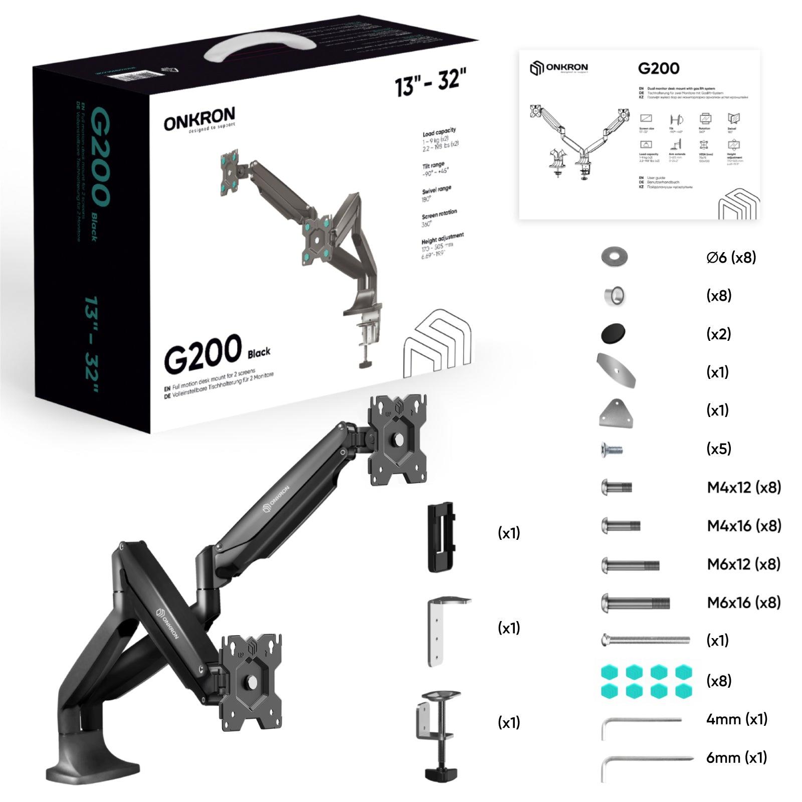 ONKRON G200-B. Mounting: Clamp/Grommet, Maximum weight capacity: 18 kg, Minimum screen size: 33 cm (13"), Maximum screen size: 81.3 cm (32"), Minimum VESA mount: 75 x 75 mm, Maximum VESA mount: 100 x 100 mm. Height adjustment, Tilt angle range: -90 - 45°. Product colour: Black