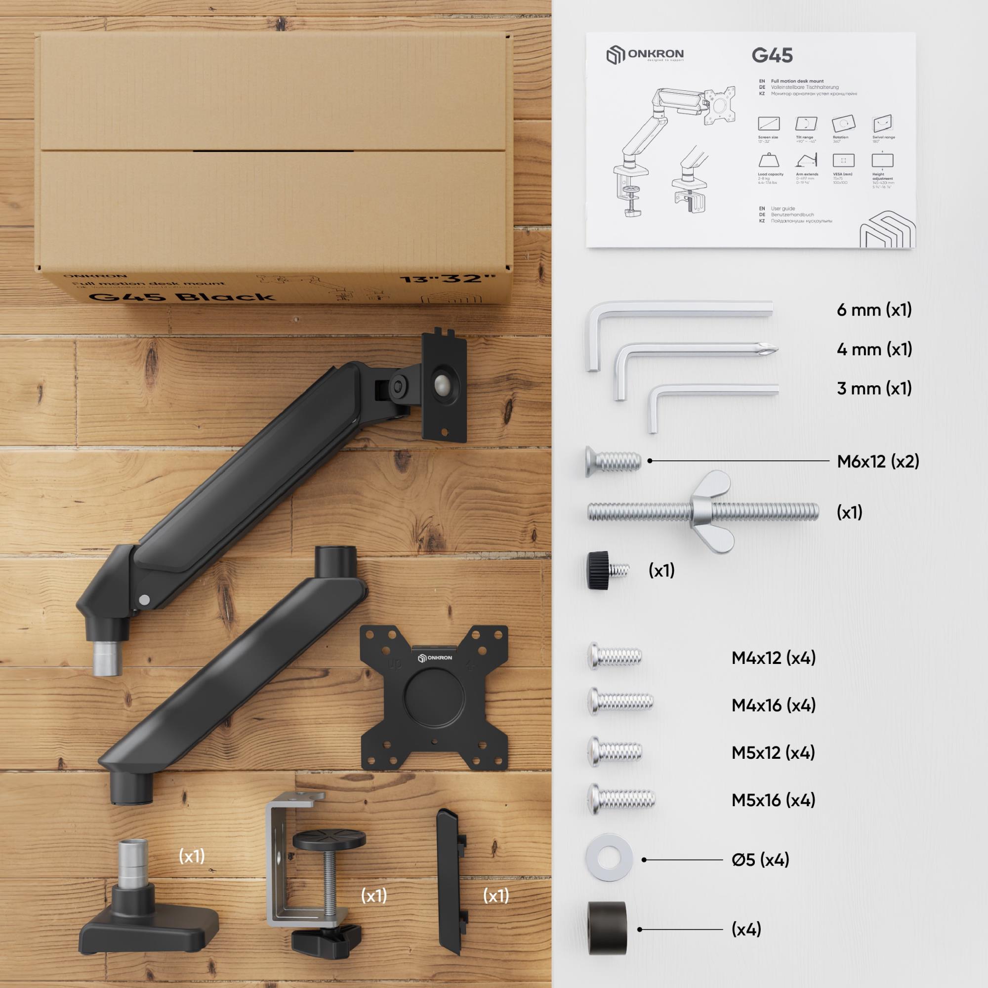 ONKRON G45-B. Mounting: Clamp/Freestanding/Grommet, Maximum weight capacity: 8 kg, Minimum screen size: 33 cm (13"), Maximum screen size: 81.3 cm (32"), Minimum VESA mount: 75 x 75 mm, Maximum VESA mount: 100 x 100 mm. Height adjustment, Tilt angle range: -45 - 90°. Product colour: Black