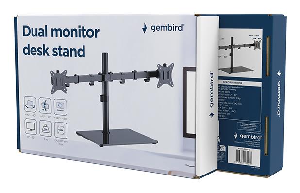 Gembird MS-D2ST-01. Maximum weight capacity: 18 kg, Minimum screen size: 43.2 cm (17"), Maximum screen size: 81.3 cm (32"), Minimum VESA mount: 75 x 75 mm, Maximum VESA mount: 100 x 100 mm. Swivel angle range: 90 - -90°, Tilt angle range: 45 - -45°. Product colour: Black
