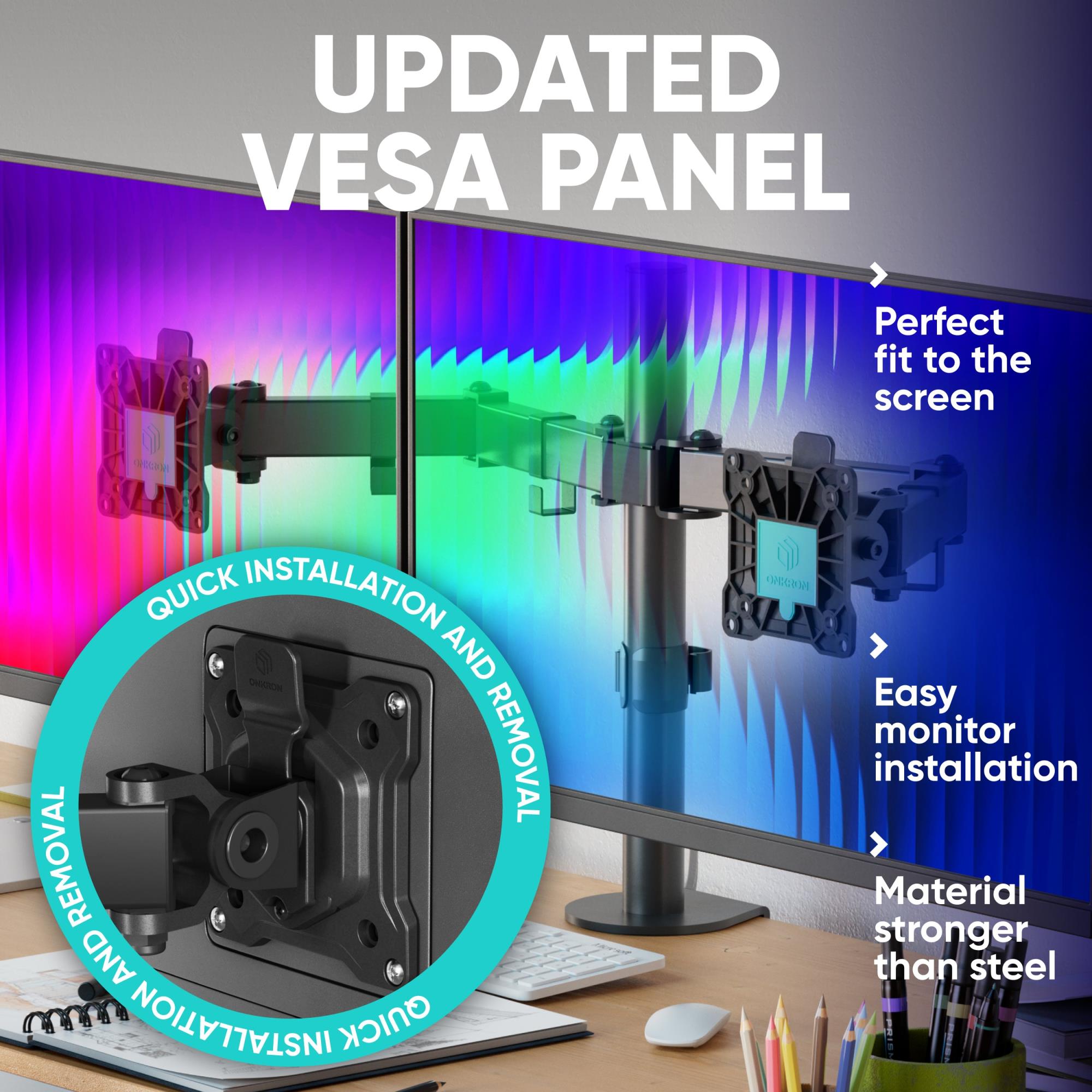Summary ONKRON D221E-B. Mounting: Clamp/Grommet, Maximum weight capacity: 16 kg, Minimum screen size: 33 cm (13"), Maximum screen size: 81.3 cm (32"), Minimum VESA mount: 75 x 75 mm, Maximum VESA mount: 100 x 100 mm. Height adjustment, Tilt angle range: -45 - 45°. Product colour: Black