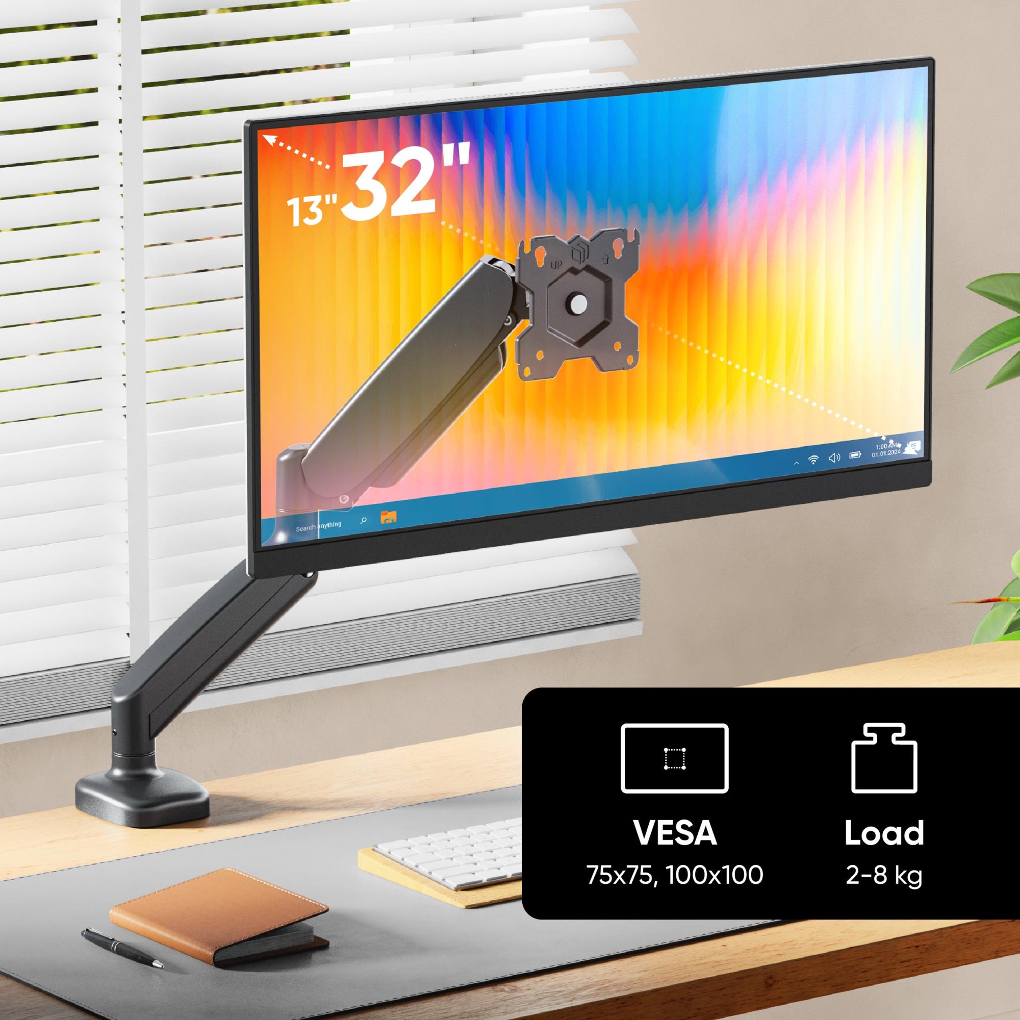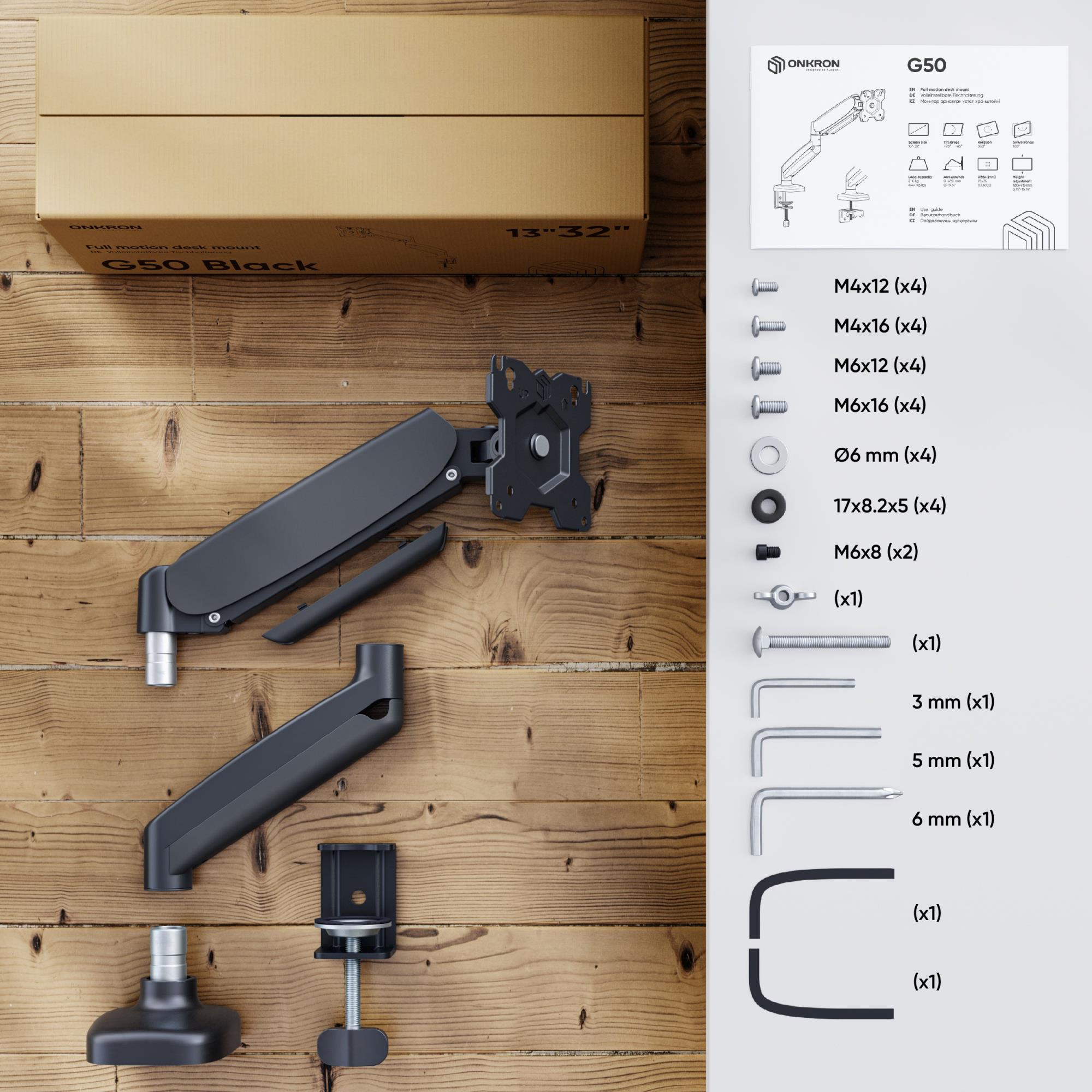 ONKRON G50. Mounting: Clamp/Grommet, Maximum weight capacity: 8 kg, Minimum screen size: 33 cm (13"), Maximum screen size: 81.3 cm (32"), Minimum VESA mount: 75 x 75 mm, Maximum VESA mount: 100 x 100 mm. Height adjustment, Tilt angle range: -45 - 90°. Product colour: Black