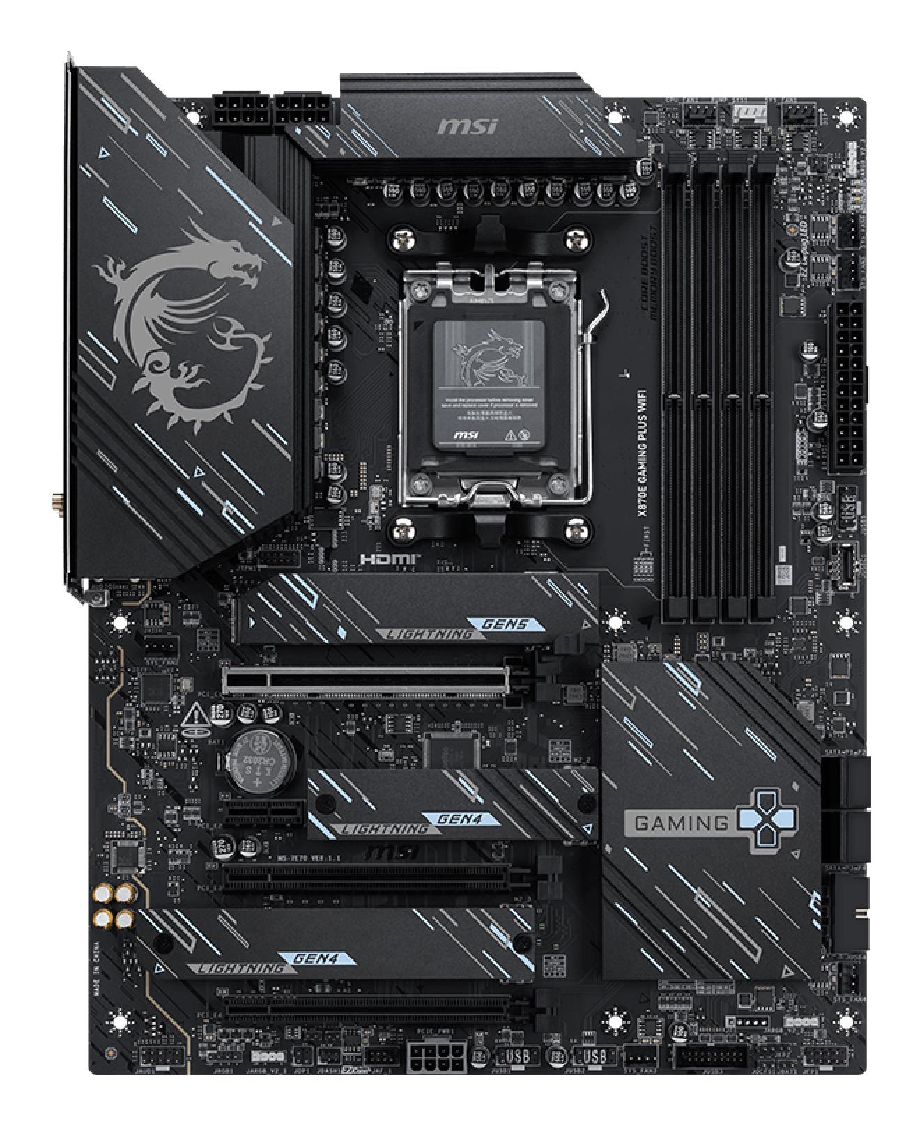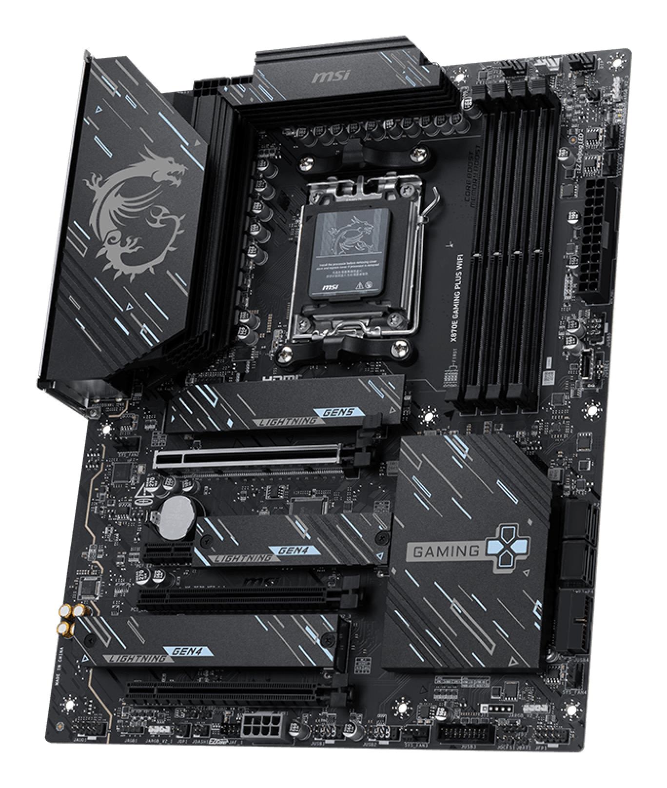Summary MSI X870E GAMING PLUS WIFI. Processor manufacturer: AMD, Processor socket: Socket AM5, Compatible processor series: AMD Ryzen 7000 Series, AMD Ryzen 8000 Series, AMD Ryzen 9000 Series. Supported memory types: DDR5-SDRAM, Maximum internal memory: 256 GB, Memory slots type: DIMM. Supported storage drive types: HDD, RAID levels: 0, 1, 5, 10. Maximum resolution: 3840 x 2160 pixels. Ethernet interface type: 5 Gigabit Ethernet, Top Wi-Fi standard: Wi-Fi 7 (802.11be), Wi-Fi standards: 802.11a, 802.11b, 802.11g, Wi-Fi 4 (802.11n), Wi-Fi 5 (802.11ac), Wi-Fi 6 (802.11ax), Wi-Fi 6E...