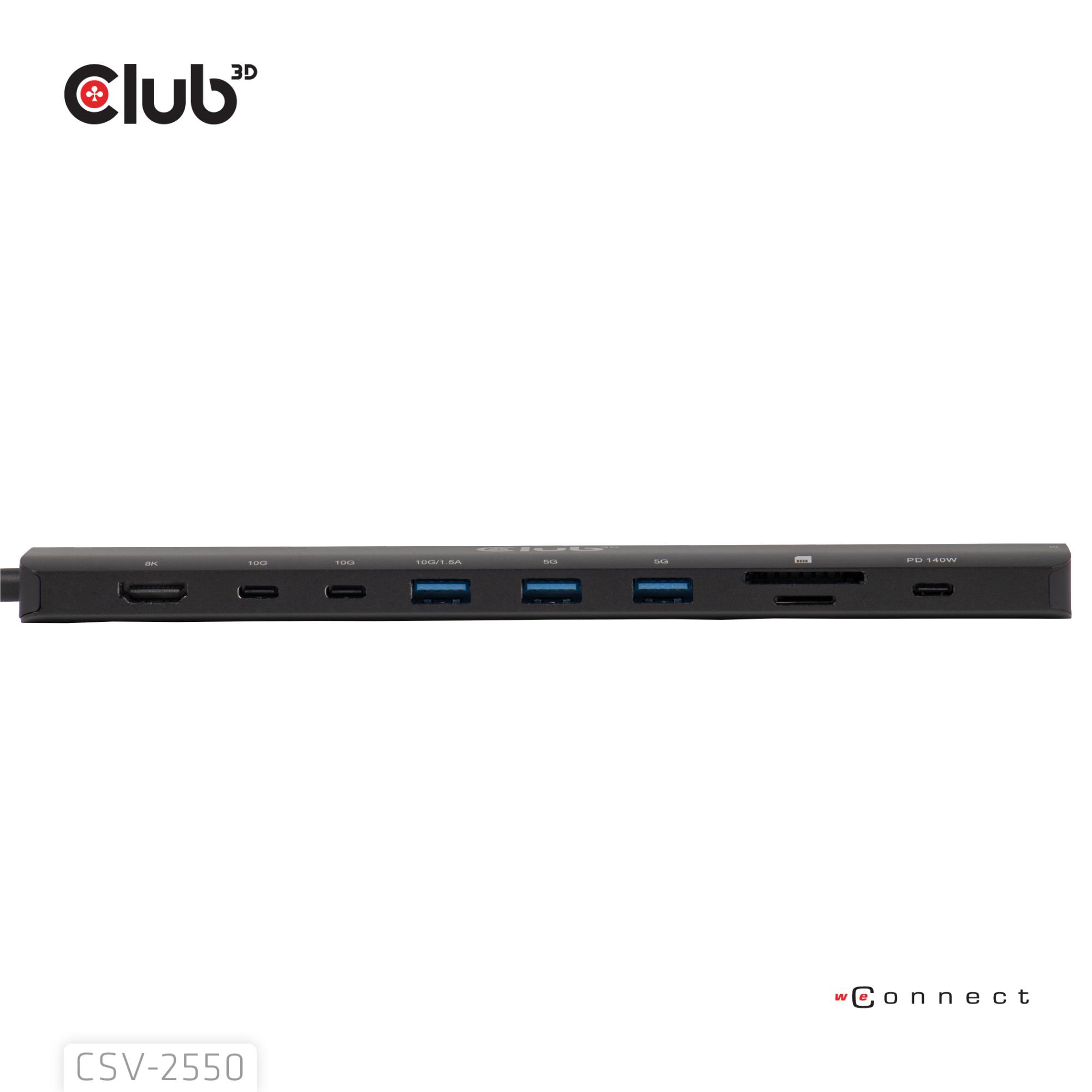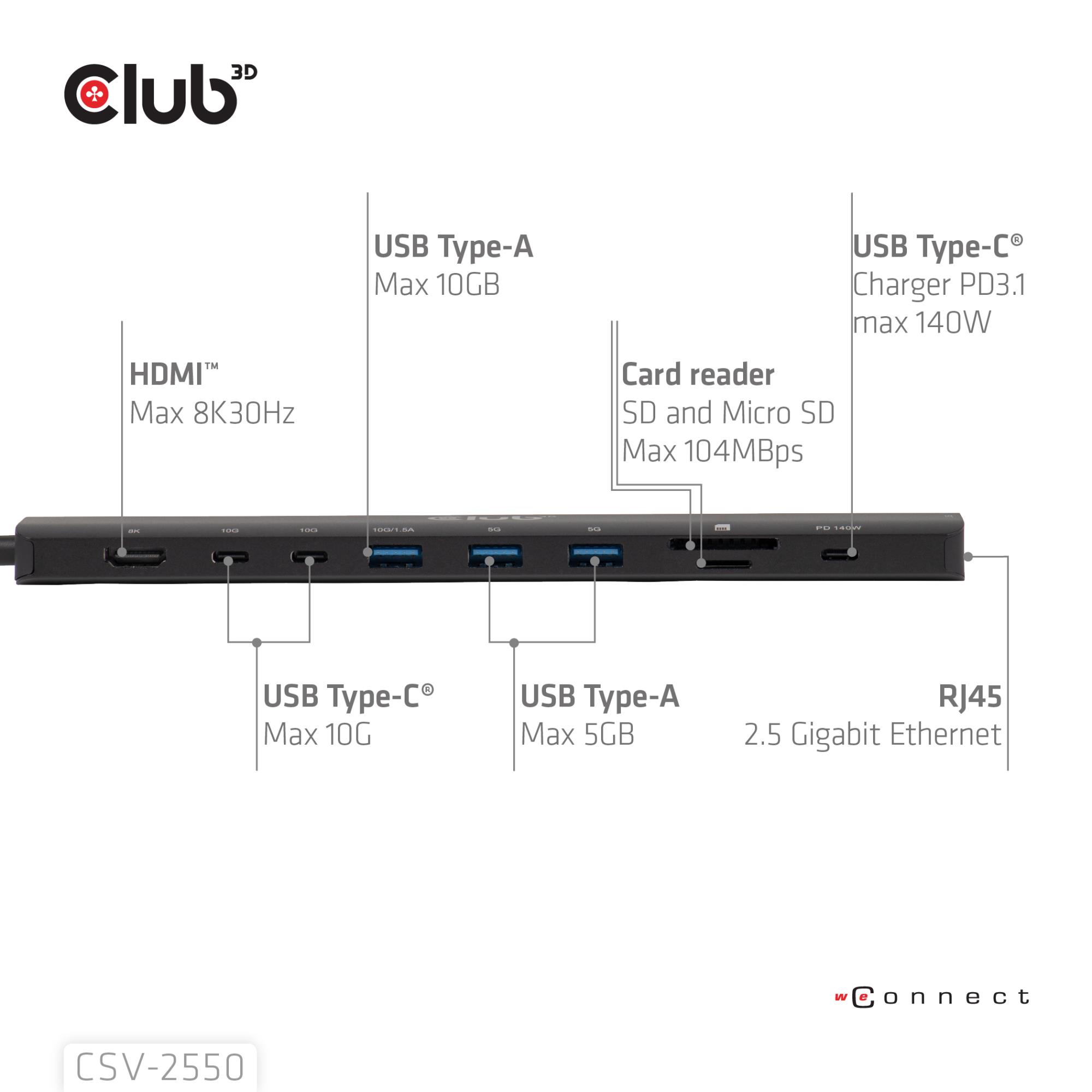 CLUB3D 10-1 Portable Dock USB Type-C® 10Gbps to HDMI™ 8K30Hz PD3.1 Max.140Watt. Connectivity technology: Wired, Host interface: USB Type-C, USB Power Delivery up to: 140 W. Ethernet LAN data rates: 10,100,1000,2500 Mbit/s. Product colour: Black, Compatible memory cards: MicroSD (TransFlash), SD, Data transfer rate: 10 Gbit/s. Power source type: USB, Power connector: USB Type-C, USB cable length: 0.19 m. Weight: 109 g
