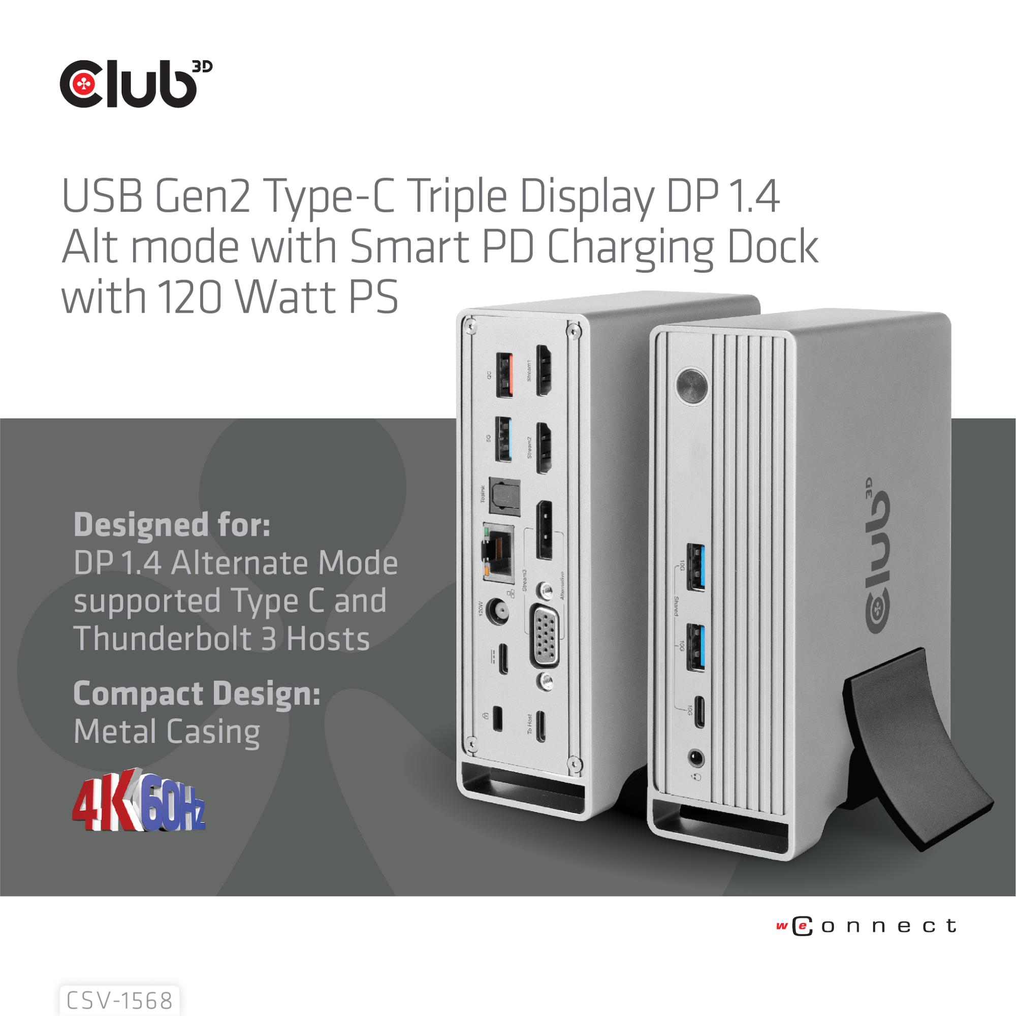 CLUB3D Docking station(Metal casing)1x USB Gen2 Type-C Female (data) 2x USB Gen2 Type-A Female 1x USB Gen1 Type-A Female 1x USB Type-A (RED) Smart Charging port 5V/2.4A Max. • 2x HDMI™ (DP Alt Mode) 1x DP™ (DP Alt Mode) hdr 1x VGA 1x RJ45 1 + 120 Watt. Connectivity technology: Docking, Host interface: USB 3.2 Gen 2 (3.1 Gen 2) Type-C, USB Power Delivery up to: 100 W. Product colour: Metallic, Data transfer rate: 16.2 Gbit/s, Maximum refresh rate: 60 Hz. Power source type: DC, Power connector: USB Type-C, AC input voltage: 100 - 240 V. Width: 139 mm, Depth: 90 mm, Height: 44 mm. Quantity per pack: 1 pc(s), Package width: 225 mm, Package depth: 155 mm