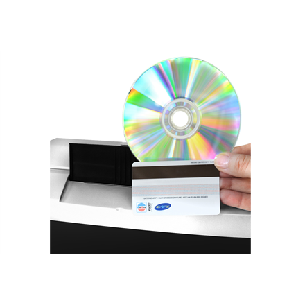 | Other features | Extra slot for CDs/DVDs and credit cards (max. 1 item per operation). Separate collection container for CDs/DVDs and credit cards for waste separation. Automatic start/stop function and reverse mode |