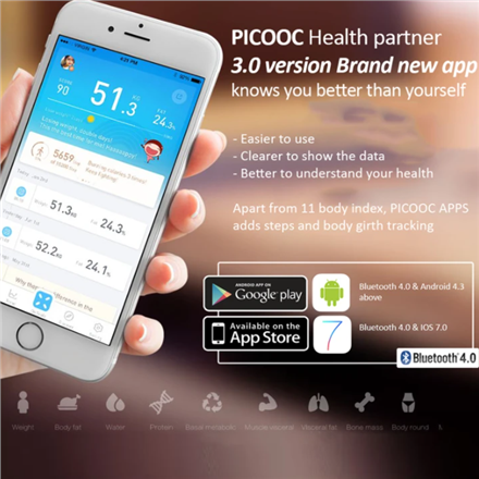 Data synchronization with Fitbit - after users turn on Fitbit sync, they can sync their body data (weight, fat) to Fitbit, and the data is synced from the last measurement when the switch was turned on. Supported with PHMS system that generates 11 body composition data: Body Fat, Body Water, Muscle Mass, Protein Mass, Bone mass, Visceral Fat, BMR, BMI, Body age. Mini is the smallest sized smart body analyser from PICOOC to help people improve their health. Bright display with large symbols, easy connection and data transfer to the app. Batteries are included so no extra care is required.