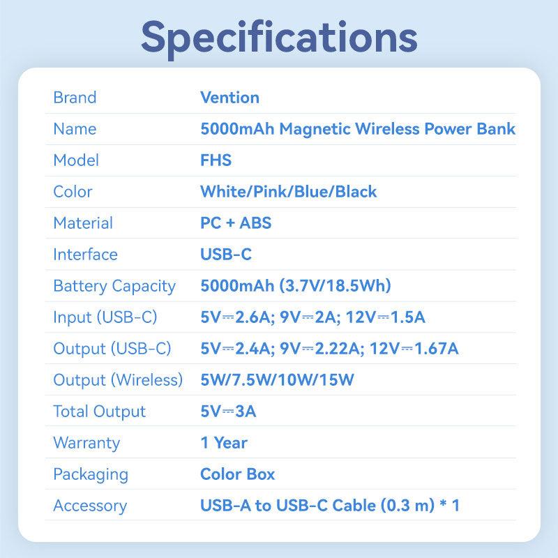 Vention FHSW0. Battery capacity: 5000 mAh, Battery voltage: 3.7 V. USB Type-C ports quantity: 1. Wireless charging. Output current: 3 A. Product colour: White