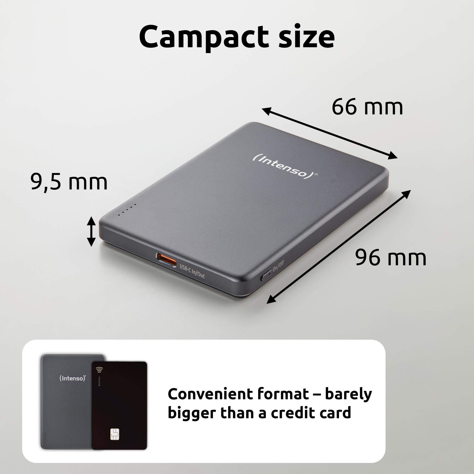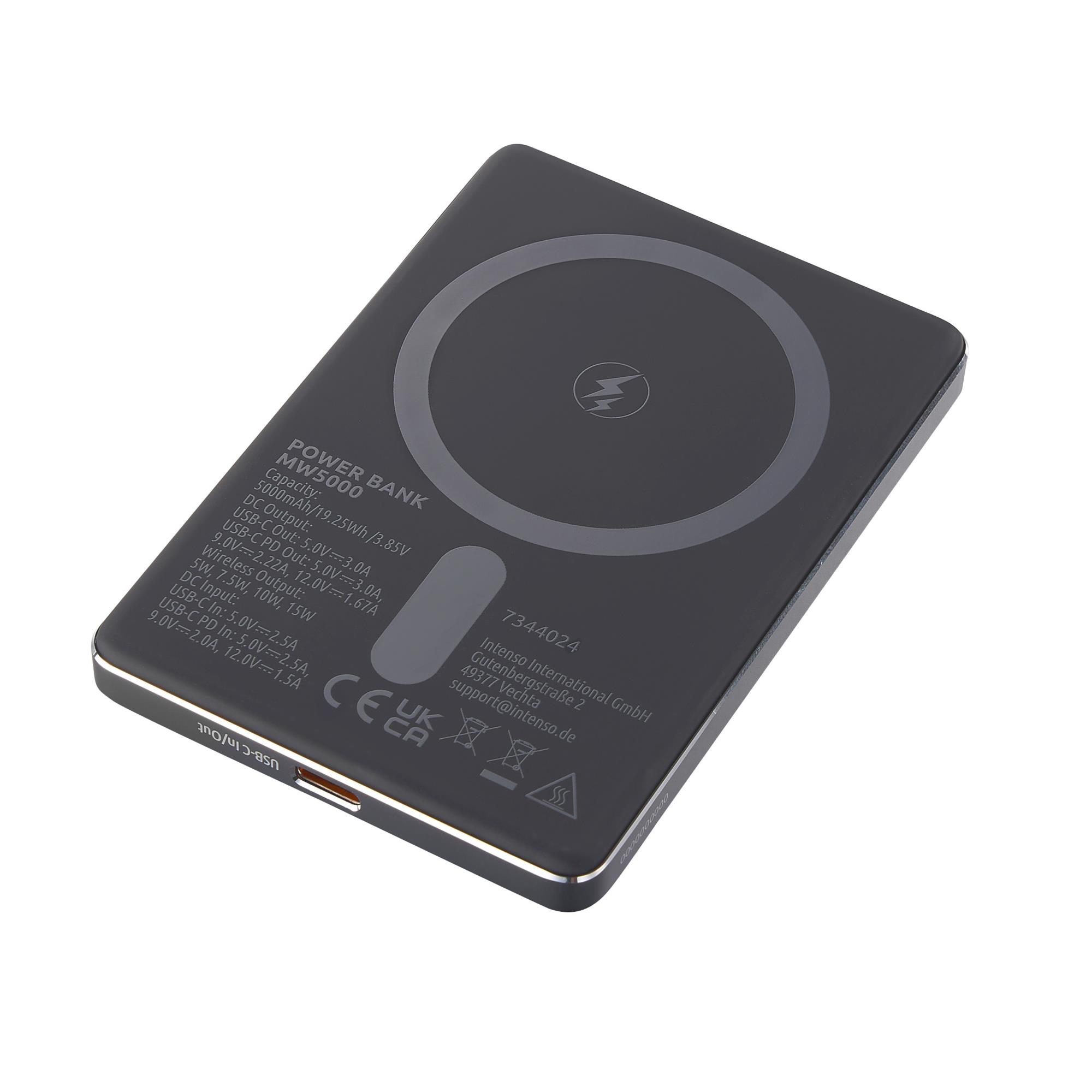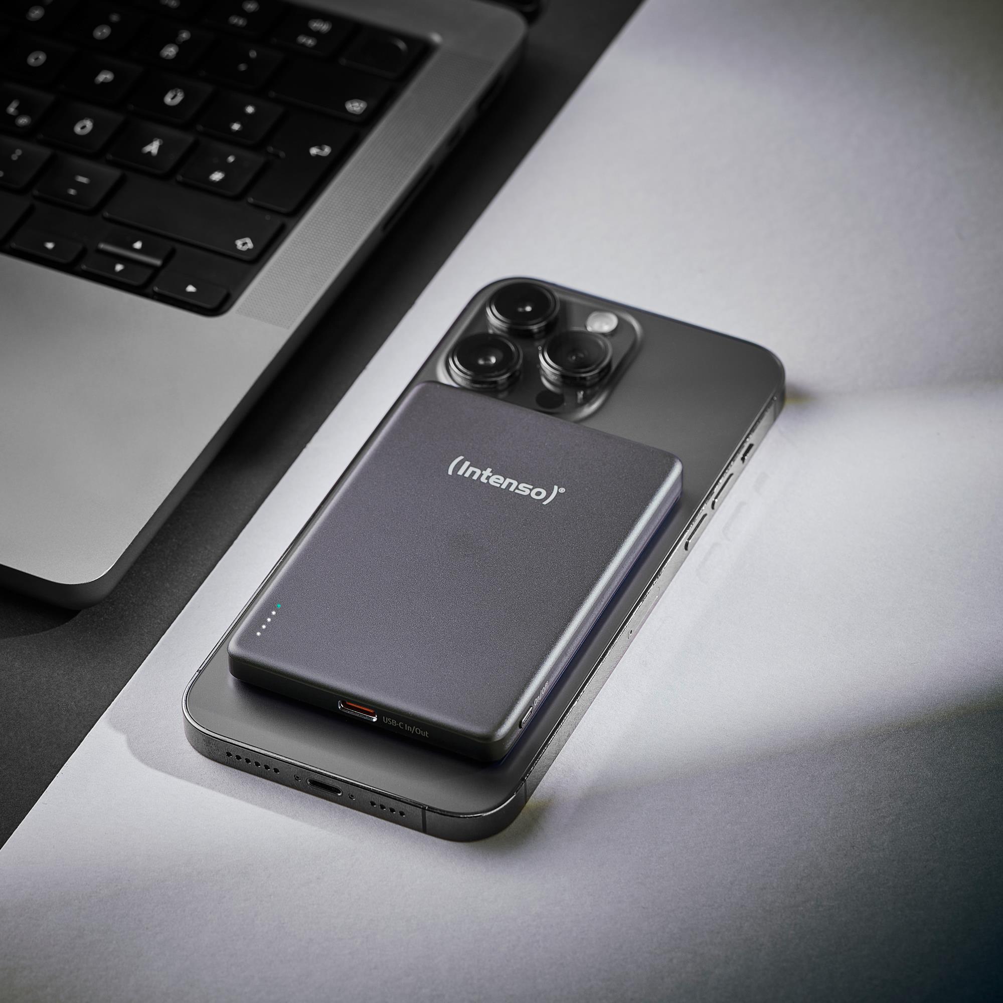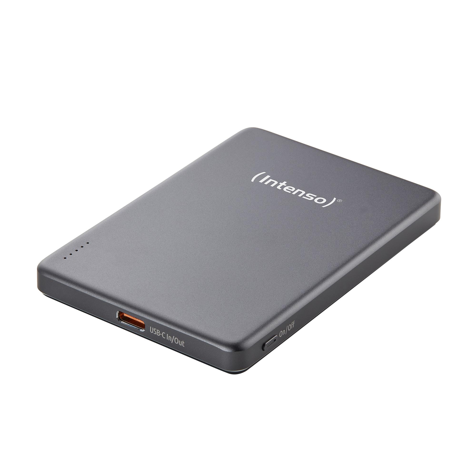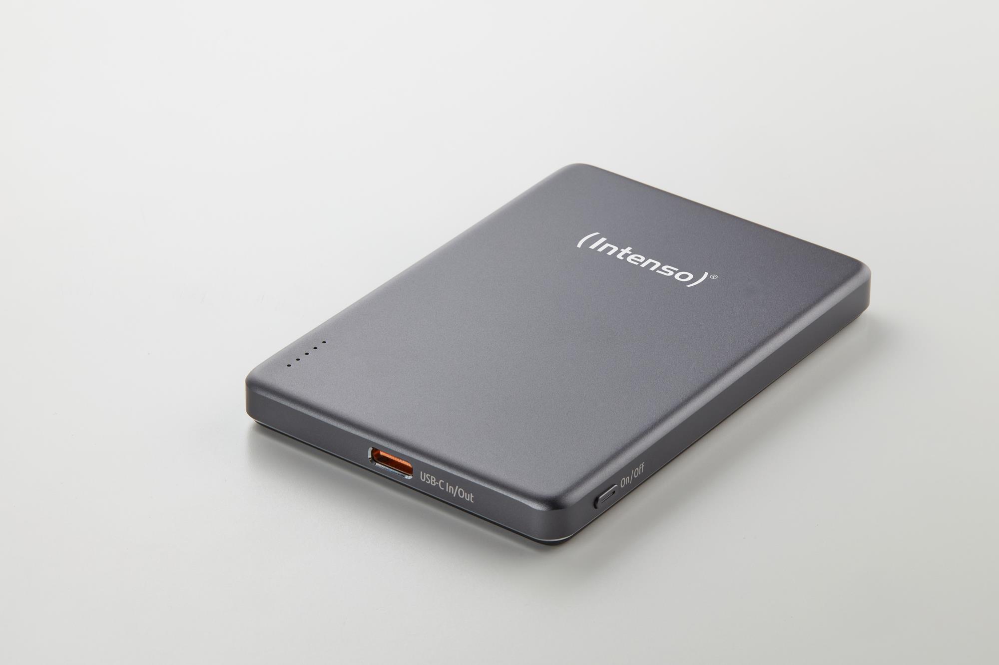 Intenso MW5000 Magnetic Power Bank 5000 mAh – MagSafe Compatible, 15W Wireless Charging, 20W USB-C PD, Slim & Compact – Tested in Germany – Gray. Battery capacity: 5000 mAh, Battery technology: Lithium Polymer (LiPo), Fast charging technology: Power Delivery, Programmable Power Supply (PPS), Battery voltage: 3.85 V. USB Type-C ports quantity: 1. Wireless charging. Product colour: Grey