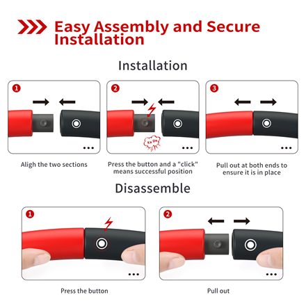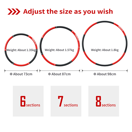 Evenly Weighted & Mute Design; Easy to assemble & Carry; Adjustable the size from 6 to 8 sections; Easy storage; Easy to clean; Carry bag included; Soft Padded Foam; Basic hula hooping can burn up to 210 calories per 30 minute workout
