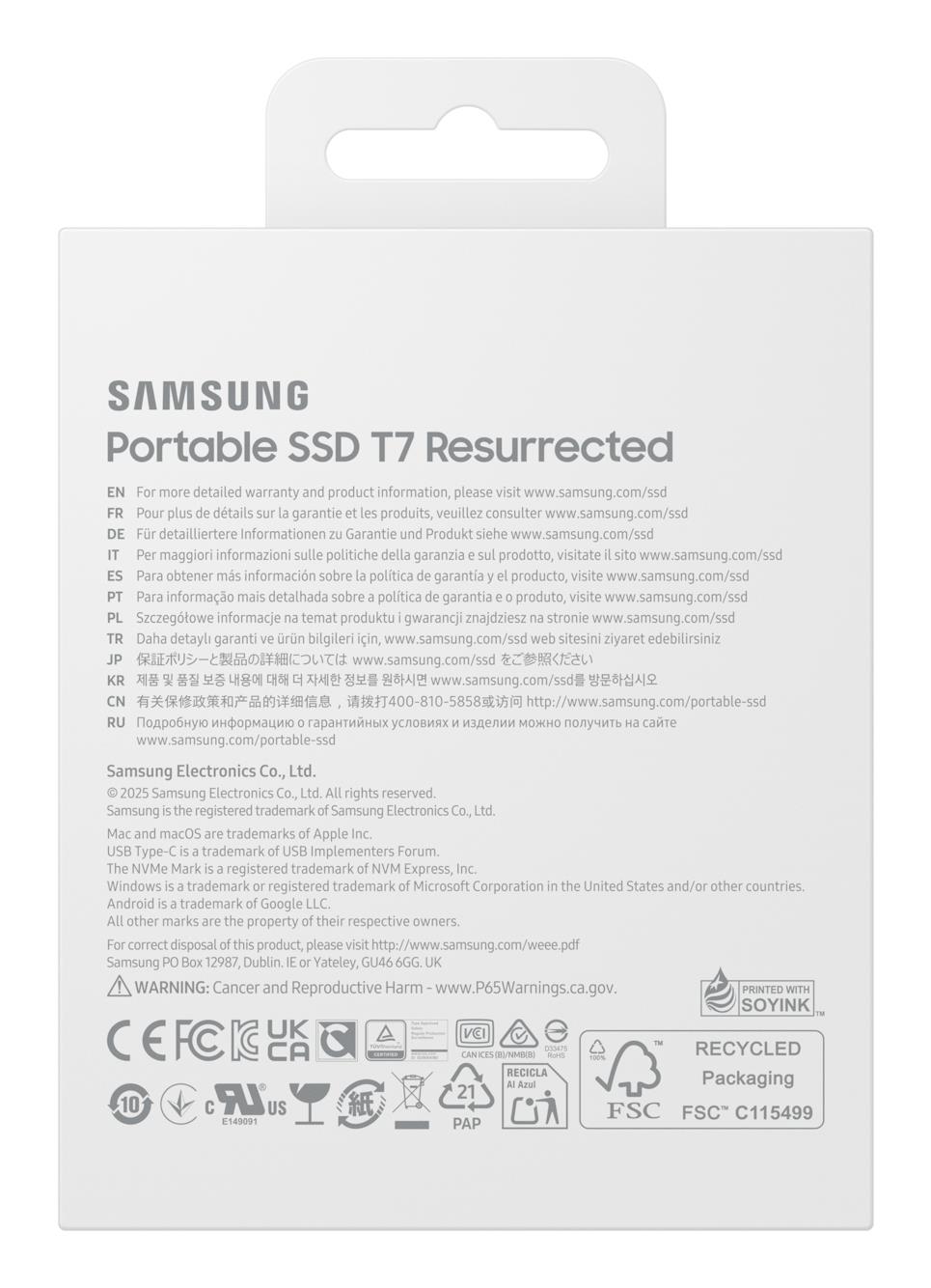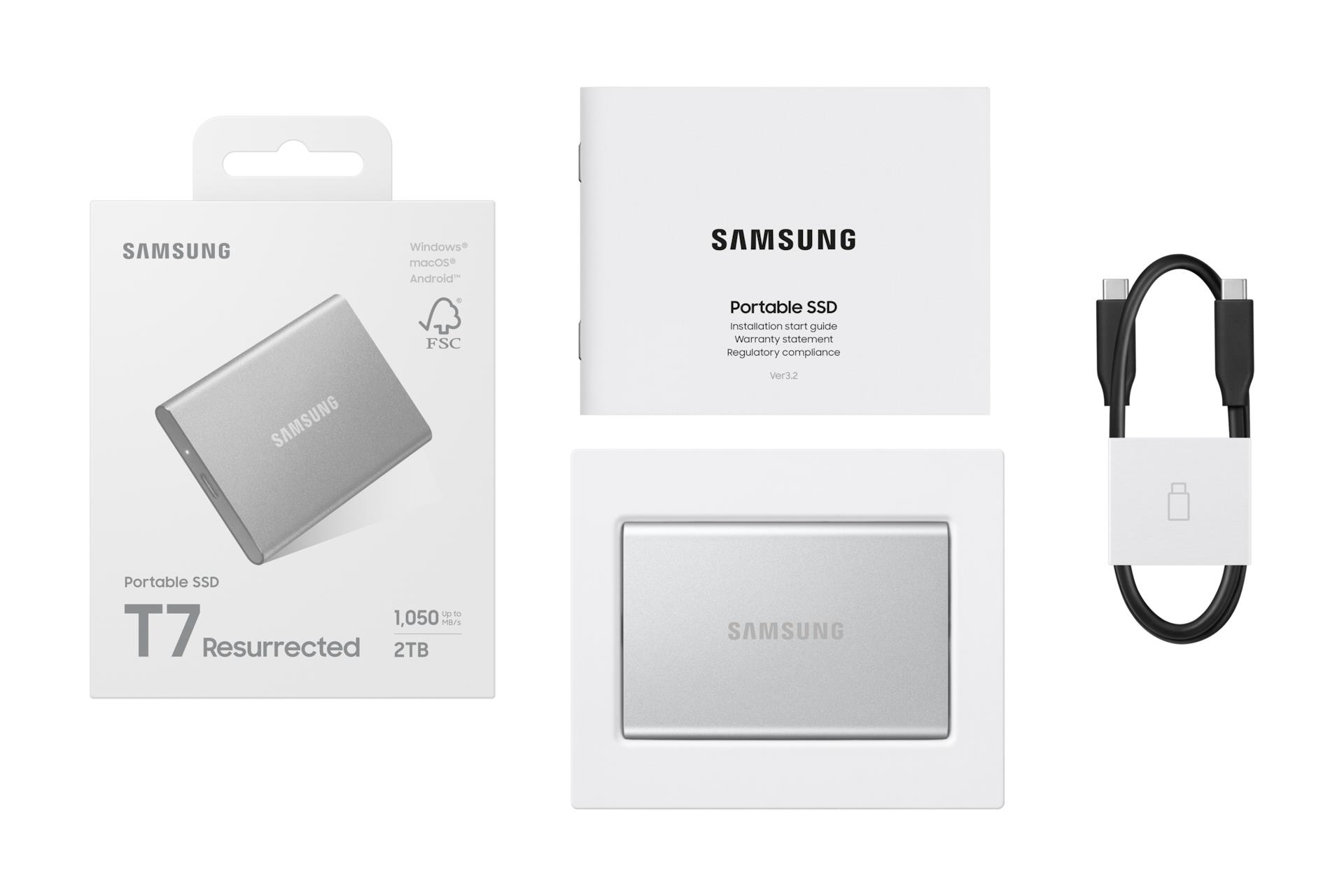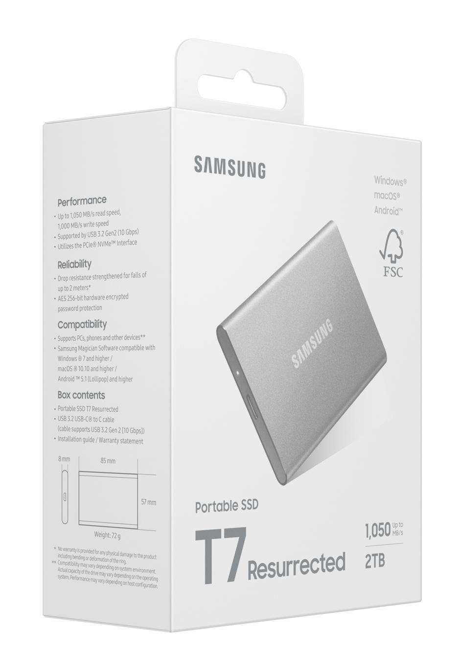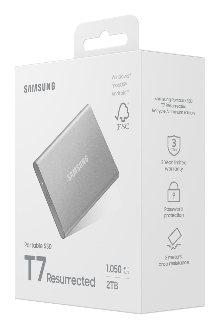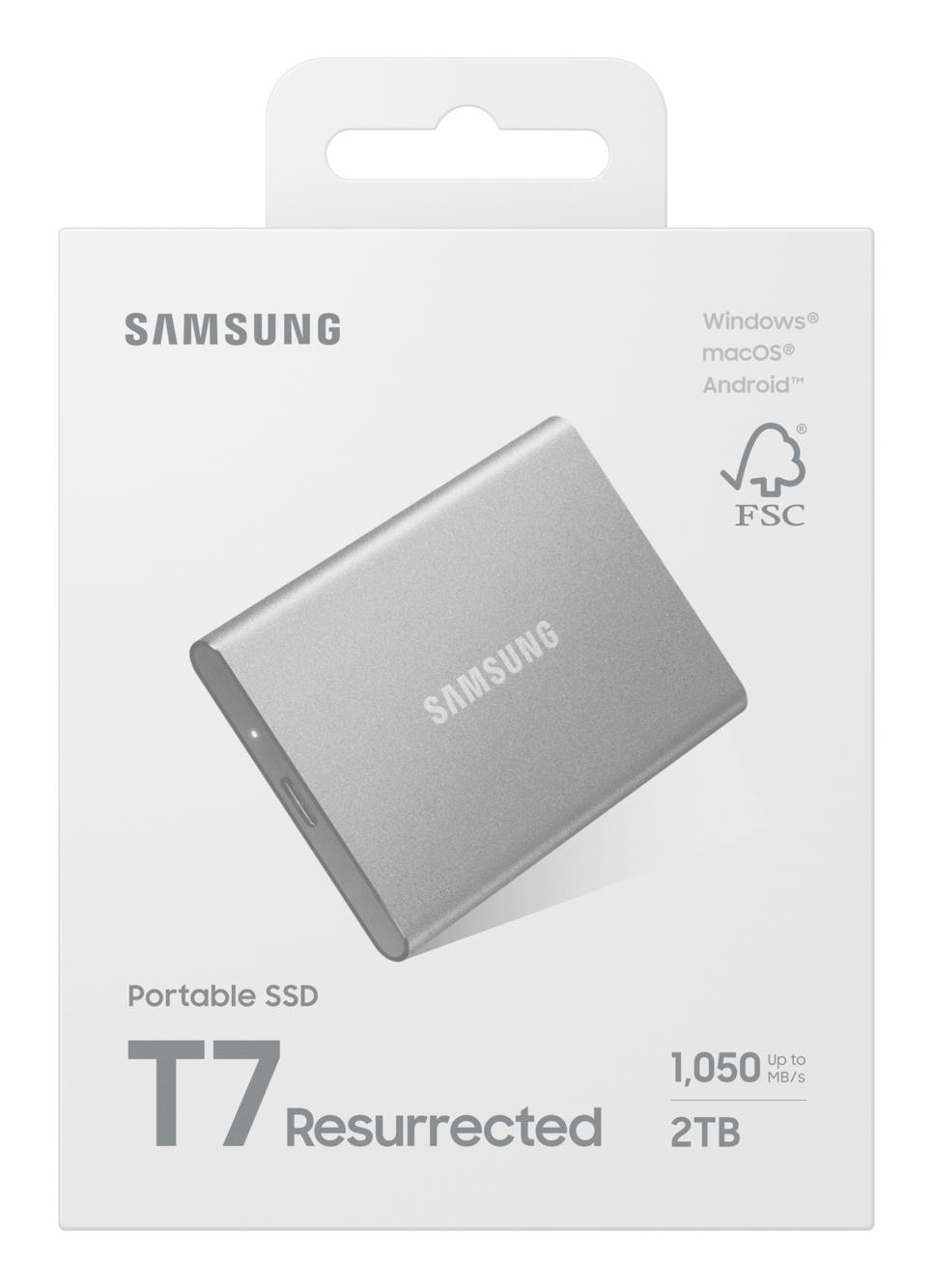 Samsung MU-PD2T0G/WW. SSD capacity: 2 TB. USB connector: USB Type-C, USB version: 3.2 Gen 2 (3.1 Gen 2). Read speed: 1050 MB/s, Write speed: 1000 MB/s. Data transfer rate: 10 Gbit/s. Password protection. Product colour: Silver