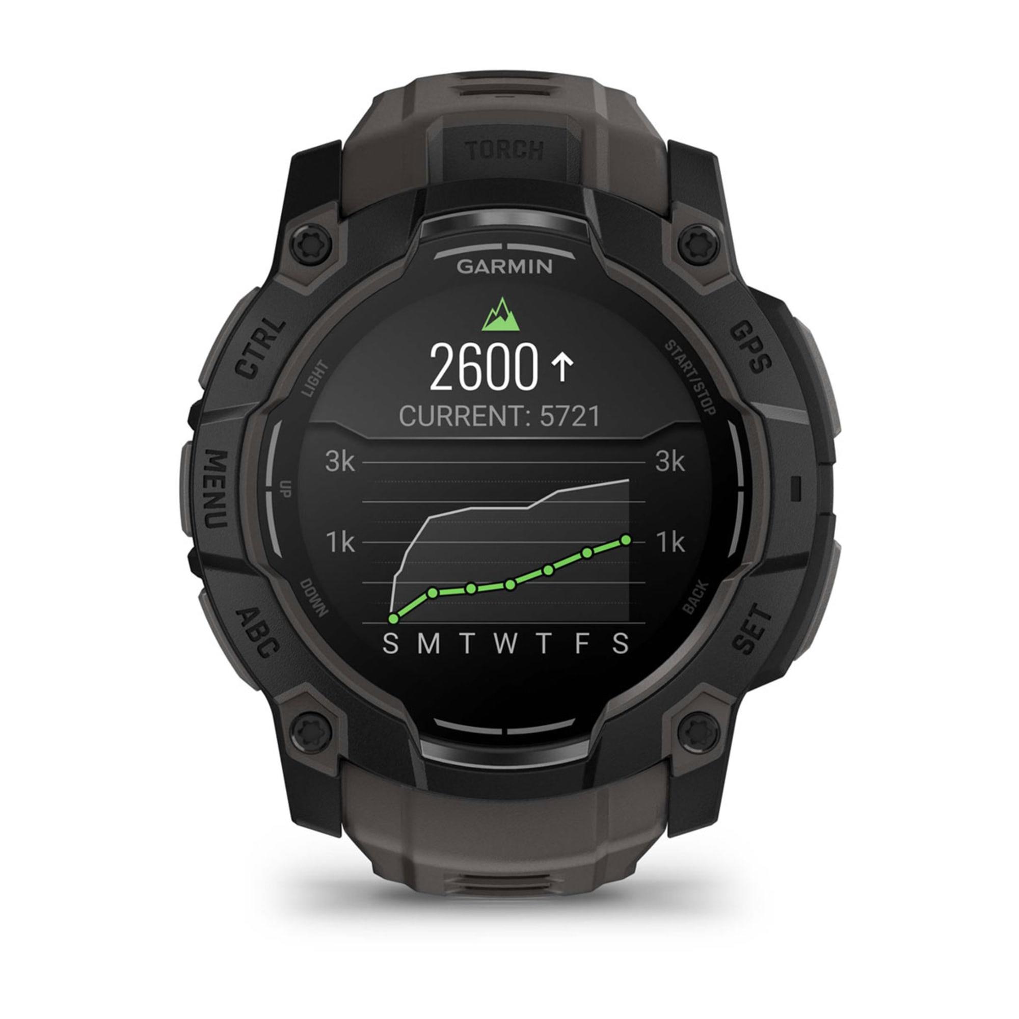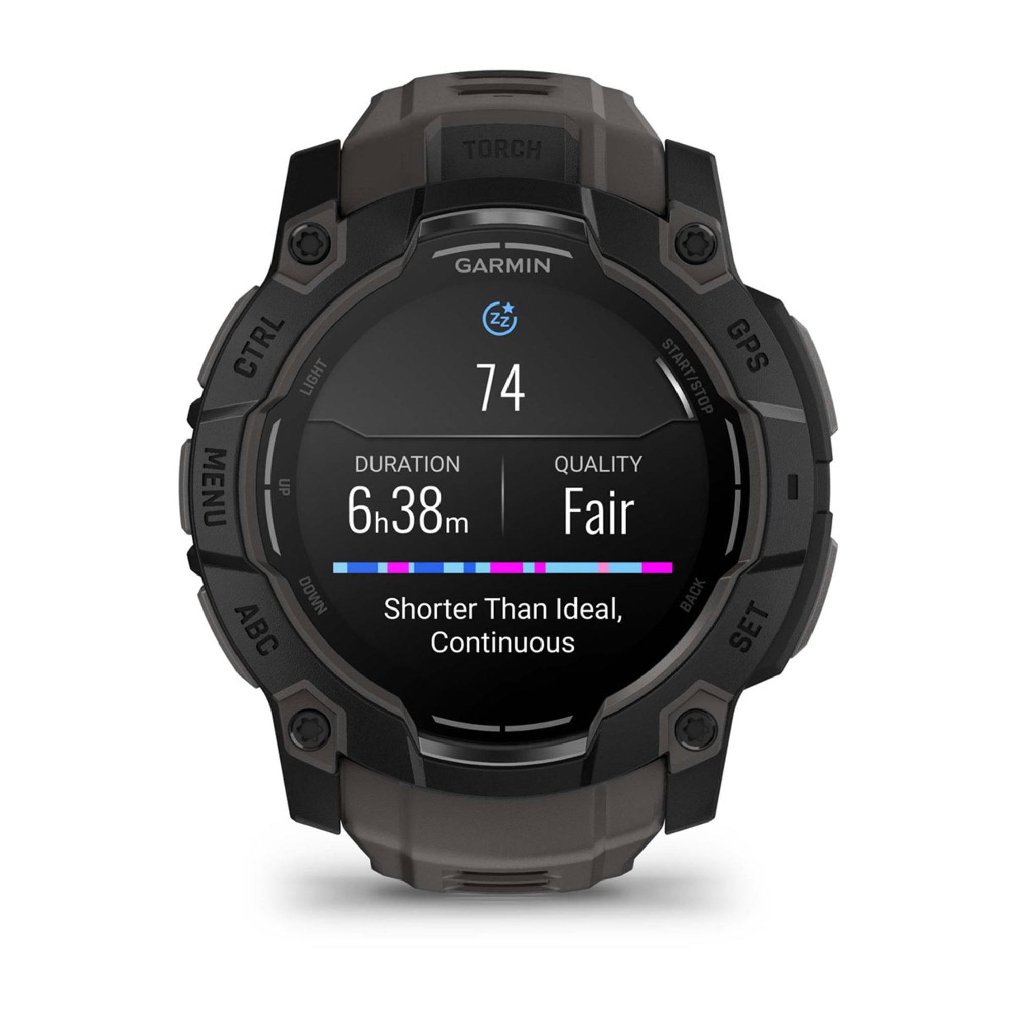 Garmin Instinct 3 AMOLED. Display diagonal: 3.3 cm (1.3"), Display technology: AMOLED, Display resolution: 416 x 416 pixels, Touchscreen. Flash memory: 4 GB. GPS (satellite). Weight: 59 g. Band material: Silicone, Band colour: Black