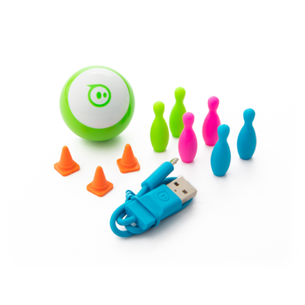 Sphero Mini; Micro USB charging cable; 3 Mini Traffic Cones and 6 Mini Bowling Pins