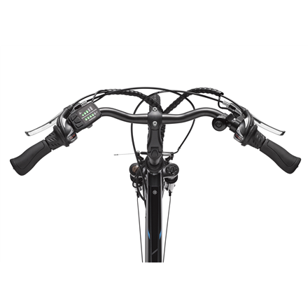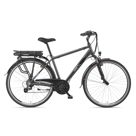 | Other features | Alu Trekking Ultralight Hydroformed (men); HL 730 AMS aluminum suspension fork; Shimano Altus 21 speed derailleur; Plastic chain guard; Trekking tires 42-622 with reflex ring; Trekking handlebar with Ergo grips; Aluminum handlebar stem, angle adjustable; Trekking saddle Selle Royal Alpine; Aluminum patent seat post; Tubular luggage rack with battery holder; Aluminum side stand; LED headlight with reflector (15 Lux), LED tail light; Rear wheel motor Telefunken 36 V 250 watts; LED display with lighting function; Battery integrated in luggage carrier Li-Ion 36 Volt / 10,4 Ah / 374,4 Wh |
