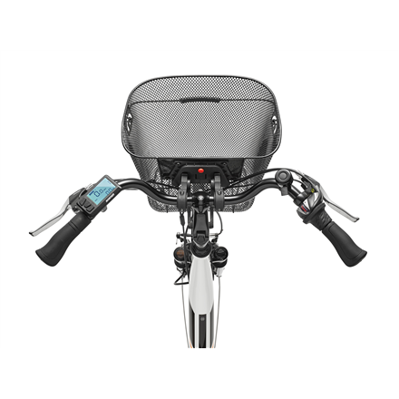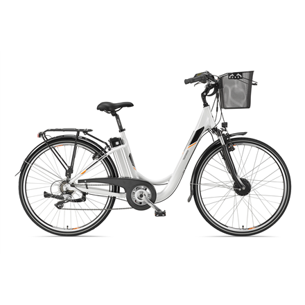 | Other features | Aluminum suspension fork HL 730 AMS; 7 speed derailleur; Hermanns plastic chain guard; City tires 42-622 with reflex ring; City handlebar with Ergo grips; Aluminum handlebar stem, angle adjustable; City Comfort saddle Selle Royal Alpine; Seatpost, 300 mm; V-strut comfort luggage rack; Alu side stand; AXA LED Ecoline headlight (15 Lux), AXA LED rear light; Removable shopping basket; Complete equipment according to STVZO; Front wheel hub motor Telefunken 36 V 250 watts; LCD display; Seat tube battery, Li-Ion 36 Volt / 10,4 Ah / 374,4 Wh |