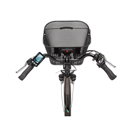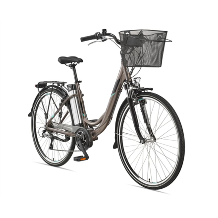 | Other features | Aluminum suspension fork HL 730 AMS; 7 speed derailleur; Plastic chain guard; City tires 42-622 with reflex ring; City handlebar with Ergo grips; Aluminum handlebar stem, angle adjustable; City Comfort saddle Selle Royal Rio; Aluminum patent seatpost; V-strut comfort luggage rack; Alu side stand; AXA LED Ecoline headlight (15 Lux), AXA LED rear light; Removable shopping basket; LCD display; Seat tube battery, Li-Ion 36 Volt / 10,4 Ah / 374,4 Wh |